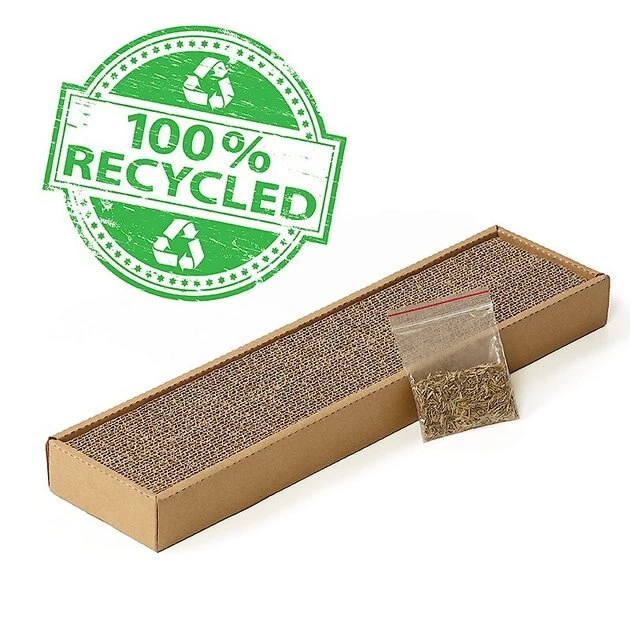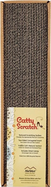 Let your feline pal satisfy his scratching and grooming needs with the MidWest Catty Scratch Cat Scratcher. The corrugated cat scratching pad will help minimize the potential damage to your furniture and belongings. It provides your feline friend with an appropriate place to scratch and groom his claws. A bag of dried catnip is included to provide an added incentive for him to use the pad. The durable corrugated cat scratcher is made of 100% recycled paper pulp and has a honeycomb texture, which mimics the bark of a tree. Plus, it’s two-sided for an even longer lasting use.