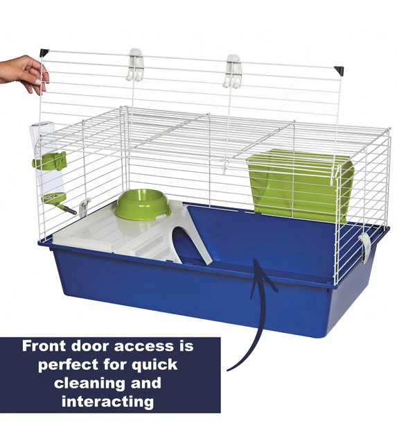 - Includes food dish, water bottle, plastic hay feeder and hiding spot.