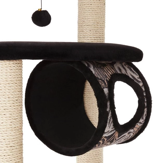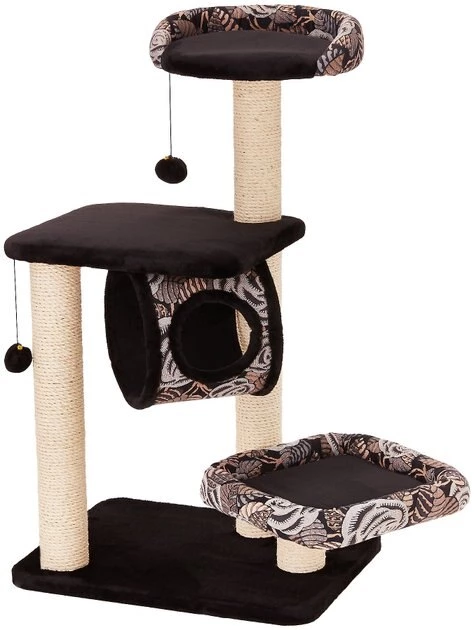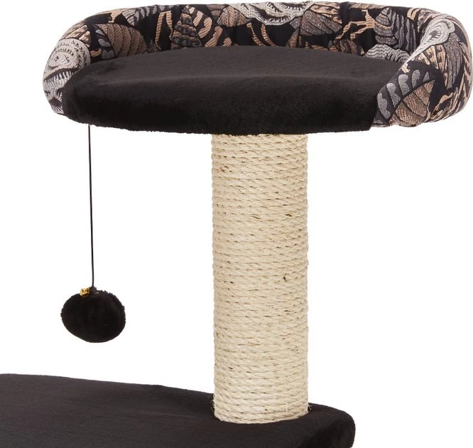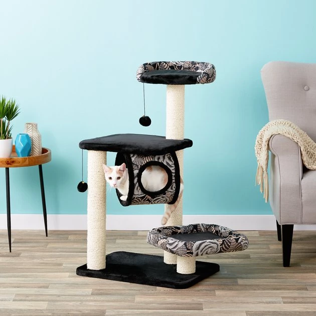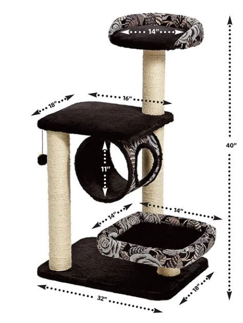 Give your kitty a spot of his own with the MidWest Feline Nuvo Escapade cat tree. Designed specifically for your feline friend, this multi-tier cat tree offers a variety of play and lounging options. The perfect addition to any cat home, the sturdy tree features an attractive black, ultra-soft faux fur and coordinating designer print fabric to complement any home decor. It comes with a strong sisal-wrapped support to provide a tough, resilient scratching post for your cat’s scratching and grooming needs. Plus, the plush, dark fabric is easy to clean from your pal’s fur and accidents. Your cat is sure to love this perfect spot with elevated retreats, areas to groom and a space for him play all he wants.