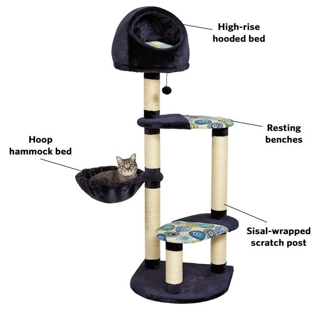 - Comes with a hoop hammock and resting platforms with sisal-wrapped supports and high-rise hooded cat bed.