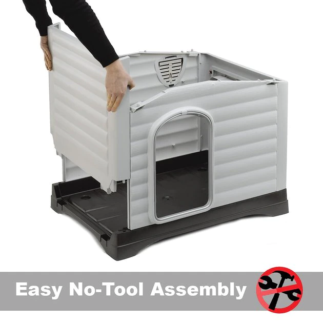 Give your furry friend his own outdoor area to rest with the MidWest Ferplast Villa Dog Kennel with Folding Porch. Made with anti-shock robust plastic, it is waterproof and UV resistant to withstand the elements. This kennel features a front entrance with a side panel that opens into a large porch, providing additional living space and ventilation for your pup. It also has a built-in drainage system to give your companion a dry living area. MidWest Ferplast Villa Dog Kennel with Folding Porch requires no tools to assemble so your paw-tner can enjoy it in no time.
