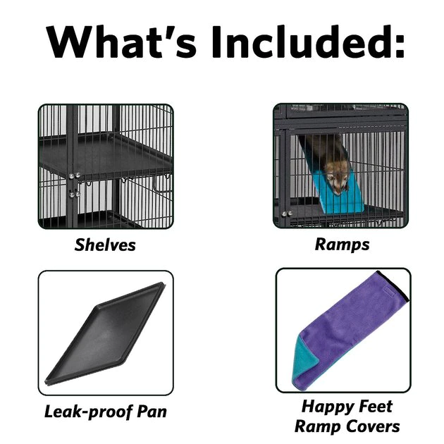 - Includes cage, stand, pan, shelf and ramp with cover.