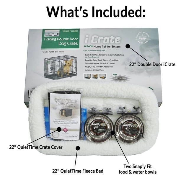 Double Door iCrate, Crate cover, QuietTime fleece pet bed, (2) Snap’y Fit pet bowls.