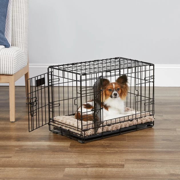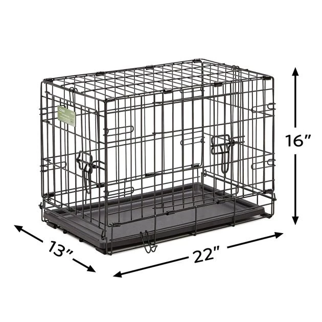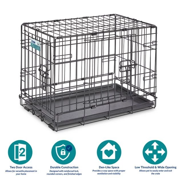 The MidWest iCrate Fold & Carry Double Door Collapsible Wire Dog Crate is the paw-fect space for your furry friend, from puppy to adulthood. Thanks to the divider panel, you can adjust the size of the living area as your puppy grows. And since accidents happen, this crate is designed with a plastic leak-proof pan, which allows for hassle-free cleanup every single time! For added security and safety, this crate now has locking tips on the slide-bolt latch(es) to securely lock the door and patented Paw Block. The Paw Block keeps your canine companion from tampering with the door lock from the inside of the crate. The patented rounded side clips protect your buddy from sharp corners, while the rubber feet on the bottom of the crate protect your floors from scratches. Best of all, this crate is paw-fect for travel because it conveniently folds down flat and has a strong, plastic carrying handle for convenient portability! Assembly and safety instructions are included with every purchase to make setup a breeze. For the best fit, check the measurements of the dog crate and select a size that will be suitable for your furry friend’s adult weight and measurements. When in doubt, size up to ensure your dog has paw-lenty of room!