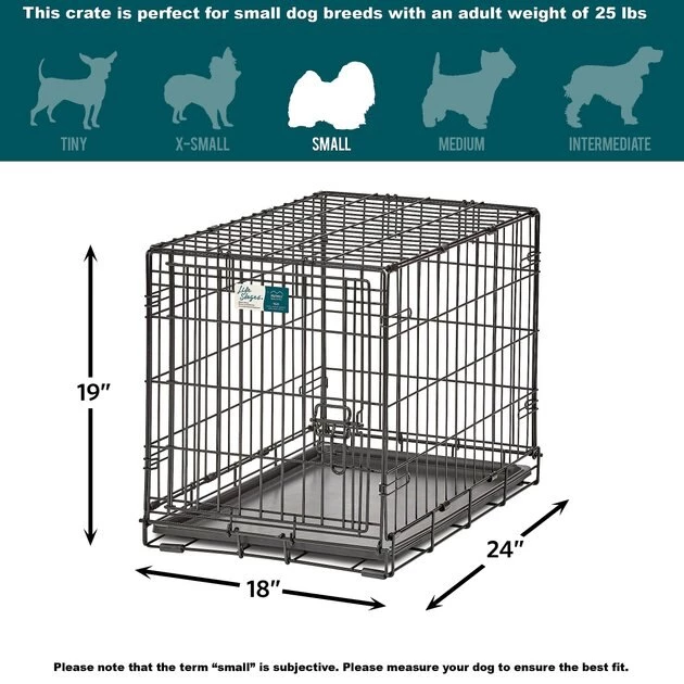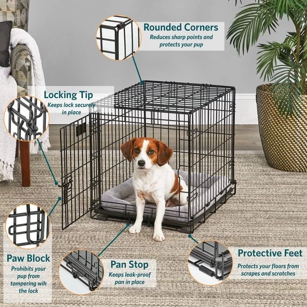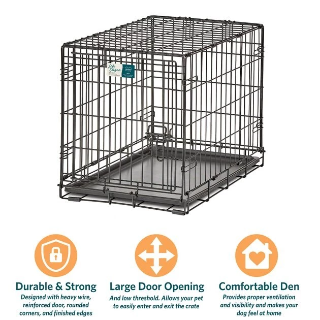 The MidWest LifeStages Single Door Collapsible Wire Dog Crate is the paw-fect space for your furry friend, from puppy to adulthood. Thanks to the divider panel, you can adjust the size of the living area as your puppy grows. And since accidents happen, this crate is designed with a plastic leak-proof pan, which allows for hassle-free cleanup every single time! For added security and safety, this crate now has locking tips on the slide-bolt latch(es) to securely lock the door and patented Paw Block. The Paw Block keeps your canine companion from tampering with the door lock from the inside of the crate. The patented rounded side clips protect your buddy from sharp corners, while the rubber feet on the bottom of the crate protect your floors from scratches. Best of all, this crate is paw-fect for travel because it conveniently folds down flat and has a strong, plastic carrying handle for convenient portability! Assembly and safety instructions are included with every purchase to make setup a breeze. For the best fit, check the measurements of the dog crate and select a size that will be suitable for your furry friend’s adult weight and measurements. When in doubt, size up to ensure your dog has paw-lenty of room!