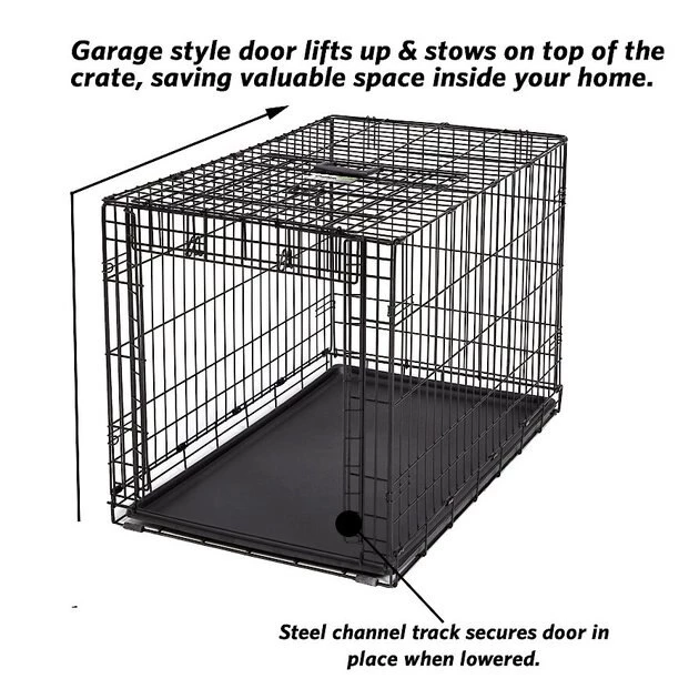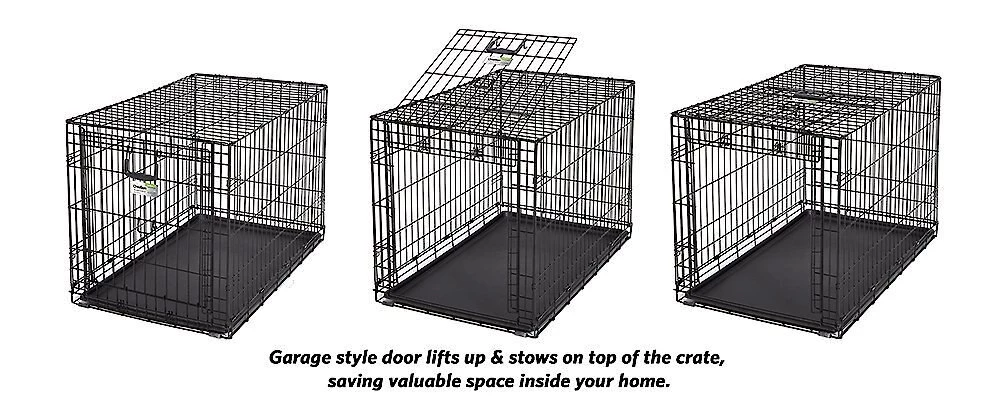- Convenient, super secure garage style door on dog crate lifts up & stows on top of the crate saving valuable space inside your home.