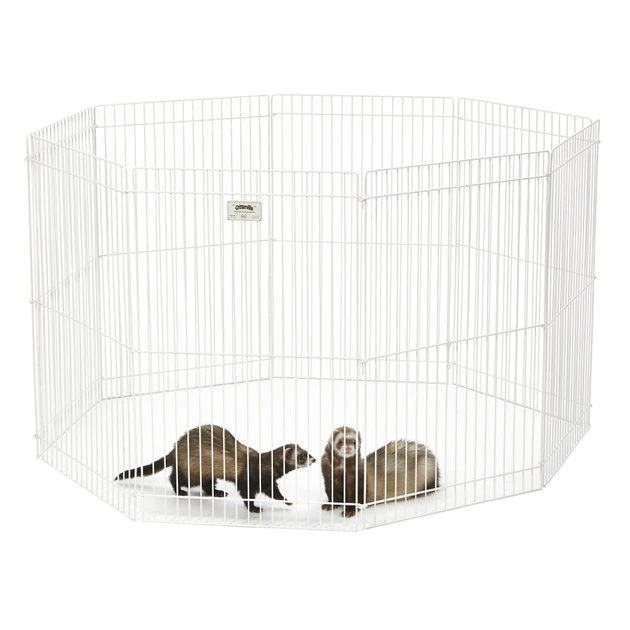 The MidWest Small Pet Exercise Pen is a convenient way to give your small friend the chance to play and stretch his legs safely. Suitable for use with ferrets, guinea pigs, rabbits and other small-sized animals, this eight-panel pen sets up in just seconds with no tools required. The epoxy-coated panels are attractive and suitable for both indoor and outdoor use, and when you’re done with the pen, it folds flat for easy storage and travel. When your furry friend is in the pen, he’ll have access to 12 square feet of space and the 15-inch panel height prevents even the most ambitious small critter from jumping or climbing out. Compact spacing of just 0.86 inches between the wires also helps to keep pets from getting a head or limb stuck.