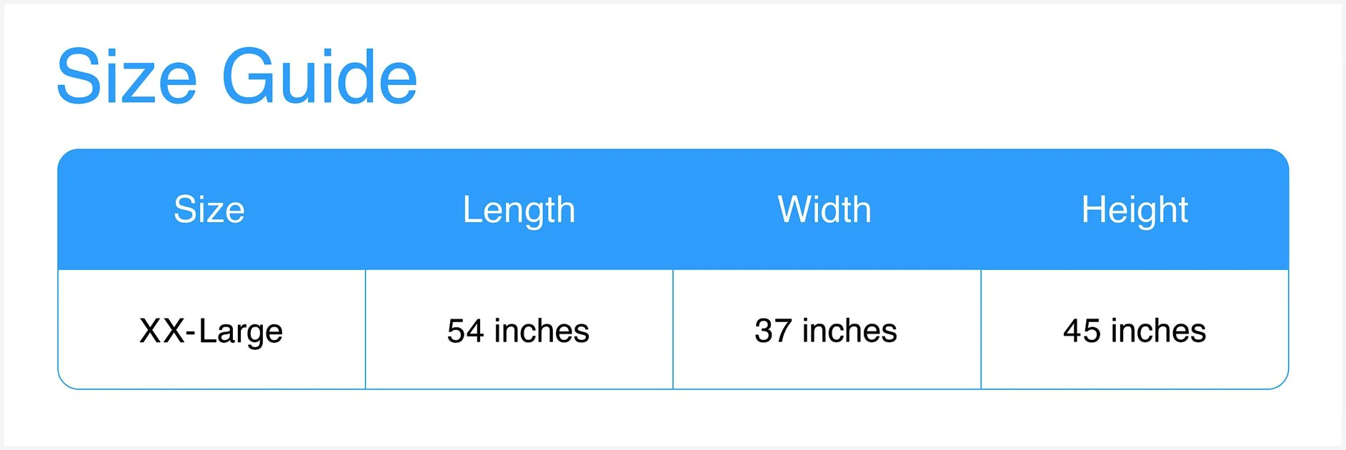 | XX-Large | 54 inches | 37 inches | 45 inches |