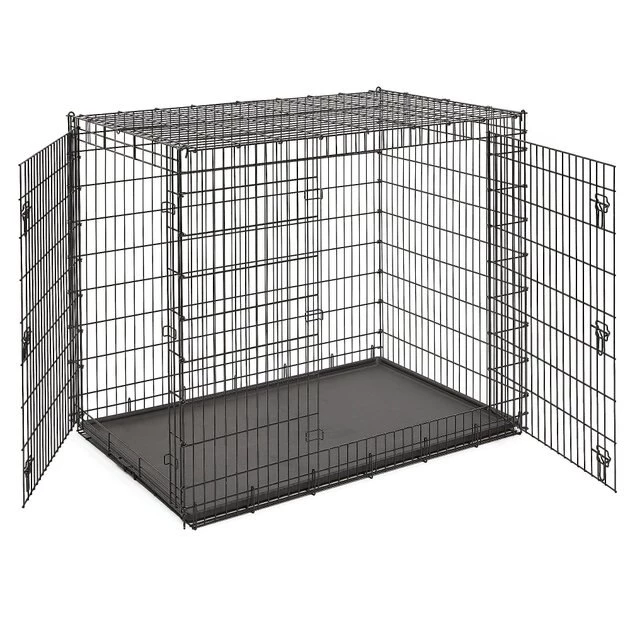Keep your pal safe and secure with the MidWest Solutions Series XX-Large Heavy-Duty dog crate. Featuring double doors, this XX-large pet crate measures 54 L x 37 W x 45 H and weighs 6.43 pounds, making it great for larger breeds like Great Danes, Mastiffs or St. Bernard’s. Made with a durable, heavy-duty metal, it has two doors for convenient front- and side-door access. Each door includes three secure slide-bolt latches for your pal’s safety. It also comes with a tough, easy-to-clean leak-proof plastic pan for those unexpected accidents. The dog crate uses a drop-pin construction ensuring maximum durability and to handle large breed dogs safely and securely. Plus, it comes equipped with a patent-pending “L” bar that horizontally runs along the middle of the top panel to prevent the side panels from bowing inwardly after assembly, this way ensuring a safe and sturdy crate for your dog.