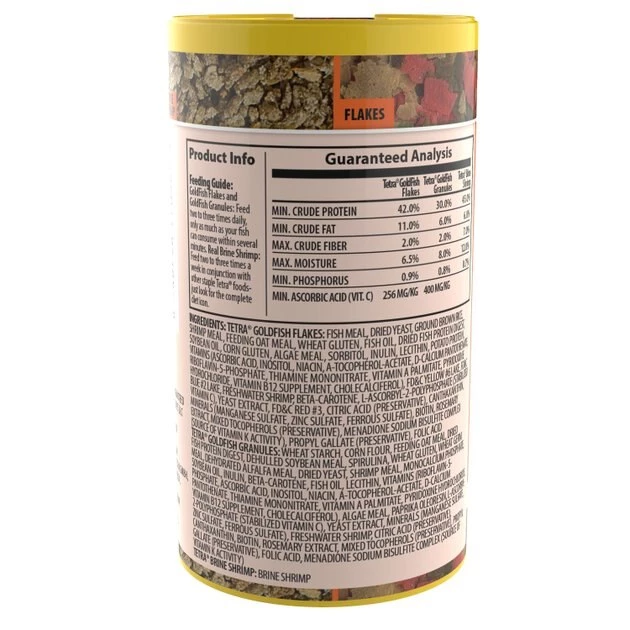 Tetra Goldfish Flakes: Fish Meal, Dried Yeast, Ground Brown Rice, Shrimp Meal, Feeding Oat Meal, Wheat Gluten, Fish Oil, Dried Fish Protein Digest, Soybean Oil, Corn Gluten, Algae Meal, Sorbitol, Inulin, Lecithin, Potato Protein, Vitamins (Ascorbic Acid, Inositol, Niacin, A-Tocopherol-Acetate, D-Calcium Pantothenate, Riboflavin-5-Phosphate, Thiamine Mononitrate, Vitamin A Palmitate, Pyridoxine Hydrochloride, Vitamin B12 Supplement, Cholecalciferol), Fd&C Yellow #6 Lake, Fd&C Blue #2 Lake, Freshwater Shrimp, Beta-Carotene, L-Ascorbyl-2-Polyphosphate (Stabilized Vitamin C), Yeast Extract, Fd&C Red #3, Citric Acid (Preservative), Canthaxanthin, Minerals (Manganese Sulfate, Zinc Sulfate, Ferrous Sulfate), Biotin, Rosemary Extract, Mixed Tocopherols (Preservative), Menadione Sodium Bisulfite Complex (Source Of Vitamin K Activity), Propyl Gallate (Preservative), Folic Acid Tetra Goldfish Granules: Wheat Starch, Corn Flour, Feeding Oat Meal, Dried Fish Protein Digest, Dehulled Soybean Meal, Spirulina, Wheat Gluten, Wheat Germ Meal, Dehydrated Alfalfa Meal, Dried Yeast, Shrimp Meal, Monocalcium Phosphate, Soybean Oil, Inulin, Beta-Carotene, Fish Oil, Lecithin, Vitamins (Riboflavin-5- Phosphate, Ascorbic Acid, Inositol, Niacin, A-Tocopherol-Acetate, D-Calcium Pantothenate, Thiamine Mononitrate, Vitamin A Palmitate, Pyridoxine Hydrochloride, Vitamin B12 Supplement, Cholecalciferol), Algae Meal, Paprika Oleoresin, L-Ascorbyl2-Polyphosphate (Stabilized Vitamin C), Yeast Extract, Minerals (Manganese Sulfate, Zinc Sulfate, Ferrous Sulfate), Freshwater Shrimp, Citric Acid (Preservative), Canthaxanthin, Biotin, Rosemary Extract, Mixed Tocopherols (Preservative), Propyl Gallate (Preservative), Folic Acid, Menadione Sodium Bisulfite Complex (Source Of Vitamin K Activity)