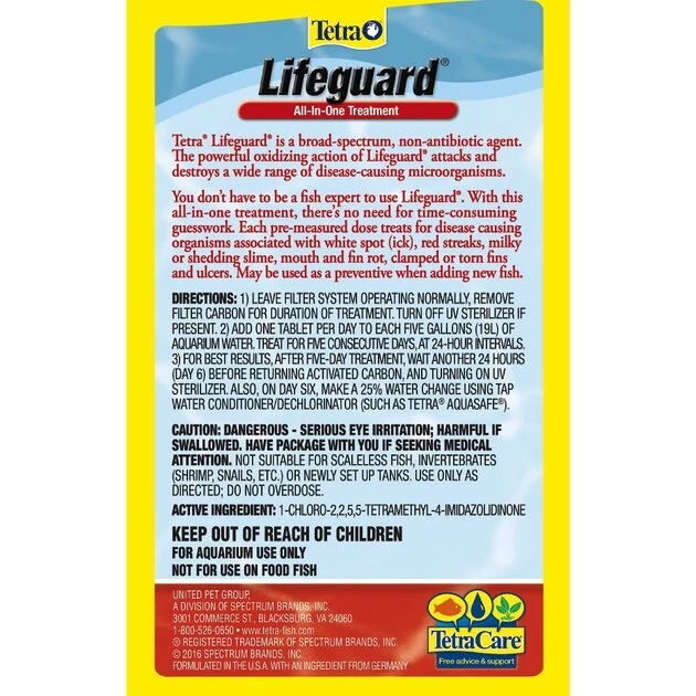 Treat and prevent a broad spectrum of diseases that can infect freshwater fish with Tetra Lifeguard All-in-One Bacterial & Fungus Treatment. Parasites, bacteria, fungus and poor water quality can cause diseases including ick, mouth and fin rot, flukes and ulcers. Tetra Lifeguard All-in-One Bacterial & Fungus Treatment is a non-antibiotic agent that treats the clinical signs of these diseases in their earliest stages within five days. It contains the powerful oxidizing action of HaloShield which destroys microorganisms and can be used as a preventative when adding new fish.