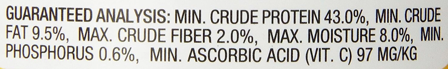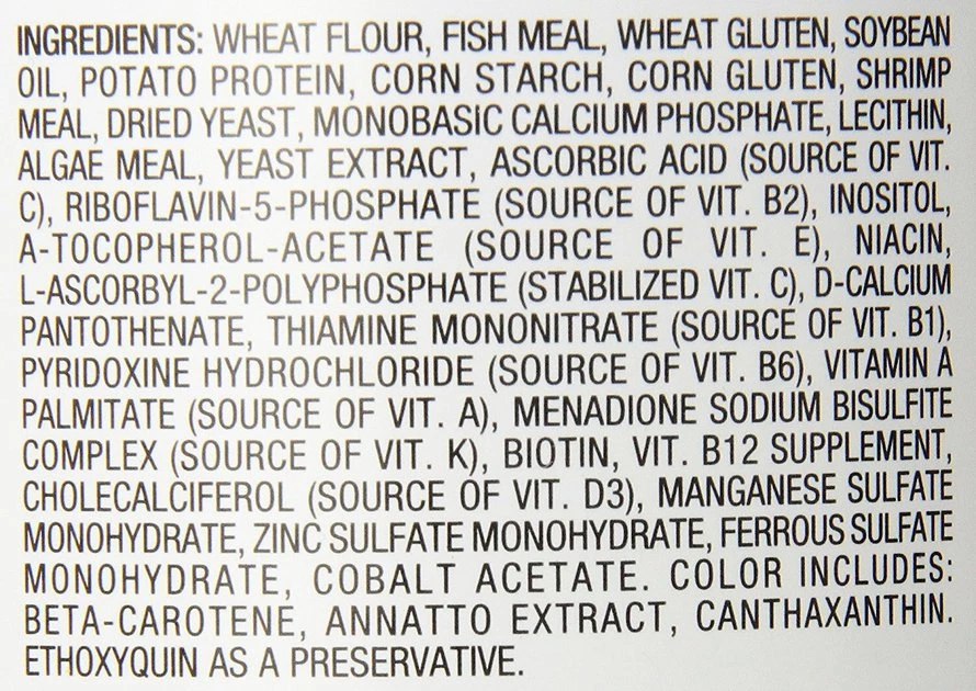 Wheat Flour, Wheat Gluten, Soybean Oil, Potato Protein, Corn Starch, Fish Meal, Corn Gluten, Shrimp Meal, Dried Yeast, Monobasic Calcium Phosphate, Lecithin, Algae Meal, Ascorbic Acid, Riboflavin 5 Phosphate, Inositol, A-Tocopherol Acetate, Niacin, L-Ascorbyl 2 Polyphosphate, D-Calcium Pantothenate, Thiamine Mononitrate, Pyridoxine Hydrochloride, Vitamin A Palmitate, Menadione Sodium Bisulfite Complex, Cyanocobalamin Cholecaliferol, Manganese Sulfate, Zinc Sulfate, Ferrous Sulfate, Cobalt Sulfate