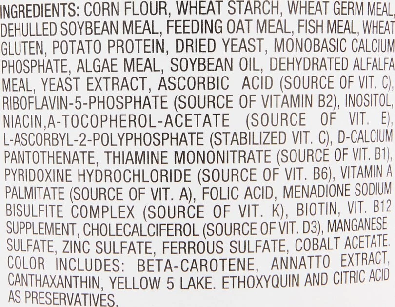 Wheat Starch, Corn Flour, Wheat Germ Meal, Dehulled Soybean Meal, Feeding Oat Meal, Fish Meal, Wheat Gluten, Potato Protein, Dried Yeast, Monobasic Calcium Phosphate, Algae Meal, Soybean Meal, Dehydrated Alfalfa Meal, Ascorbic Acid, Riboflavin 5 Phosphate, Inositol, Niacin, A-Tocopherol Acetate, L-Ascorbyl 2 Polyphosphate, D-Calcium Pantothenate, Thiamine Mononitrate, Pyridoxine Hydrochloride, Vitamin A Palmitate, Menadione Sodium Bisulfite Complex, Folic Acid, Cyanocobalamin, Cholecalciferol, Manganese Sulfate Monohydrate, Zinc Sulfate Monohydrate, Ferrous Sulfate Monohydrate, Cobalt Nitrate Hexahydrate