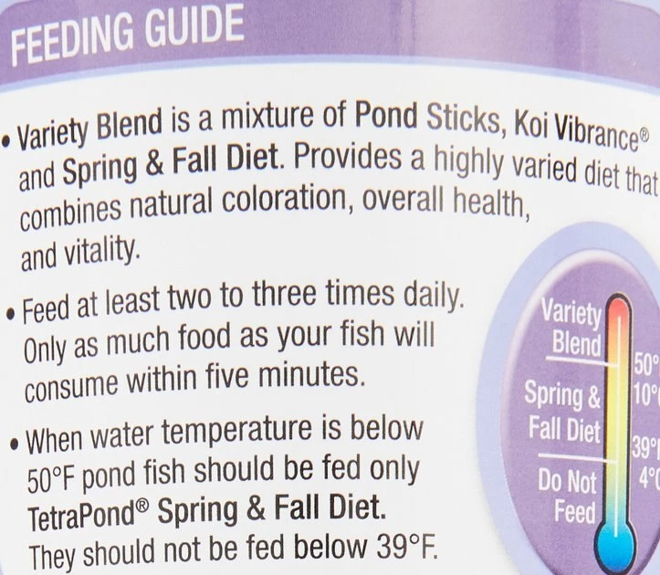 Feed at least 2 – 3 times daily only as much food as your fish will consume within 5 minutes. When water temperature is below 50 degrees pond fish should only be fed TetraPond Spring and Fall diet. Fish should not be fed when the temperature is below 39 degrees.