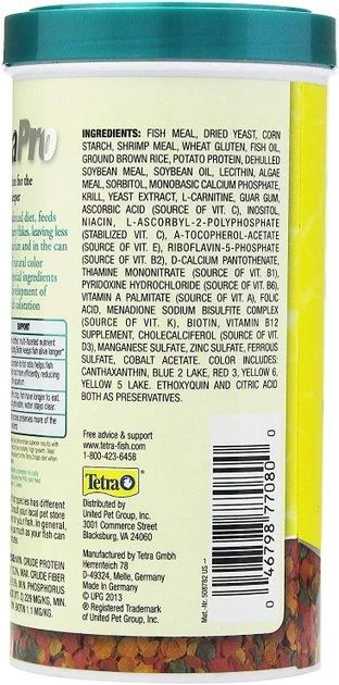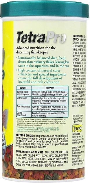 Give your finned friend a delicious and nutritious meal with Tetra TetraPro Tropical Fish Color Crisps Fish Food. These flakes contain a high content of natural color enhancers and an optimized protein-to-fat ratio to help your fish metabolize food more efficiently. It is also made with a low-heat process and enhanced with biotin to support your underwater buddy’s immune system. Tetra TetraPro Tropical Fish Color Crisps Fish Food leaves less waste behind for more usable food and clearer water.