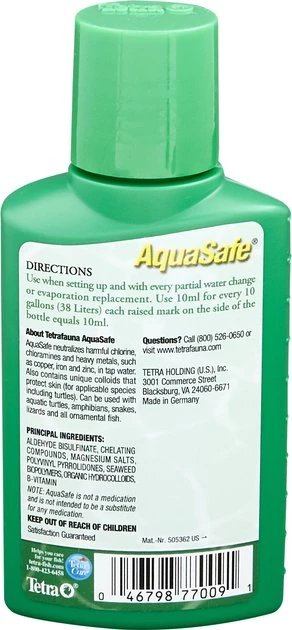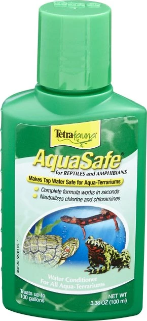 Make tap water safe for reptiles and amphibians with Tetrafauna AquaSafe Reptile Water Conditioner. Tap water contains chlorine, chloramine and heavy metals like copper, iron and zinc which can be harmful to your pet. Tetrafauna AquaSafe Reptile Water Conditioner works in seconds to neutralize these toxins, making the water safe for living conditions. It also contains unique colloids to help protect your pet’s skin and is safe to use with frogs, newts, salamanders, aquatic turtles, snakes, lizards and ornamental fish.