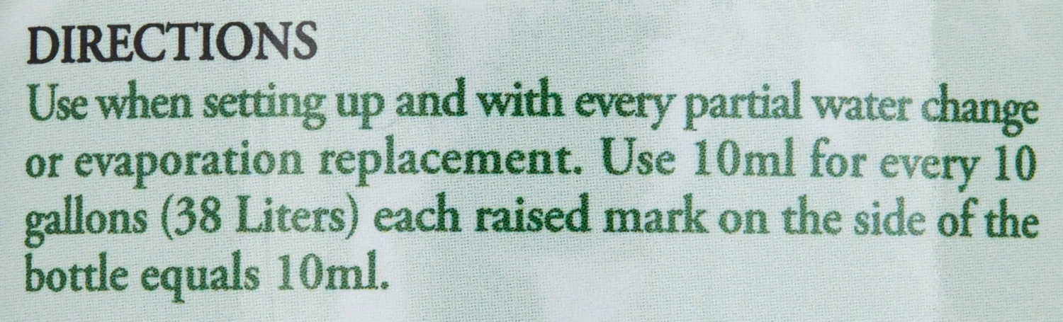 Treat water when setting up a new aqua-terrarium and with monthly partial water changes or evaporation replacement. Use 1 teaspoon to treat 10 gallons of water.