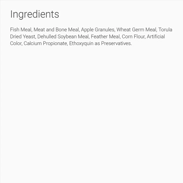 Fish Meal, Meat and Bone Meal, Apple Granules, Wheat Germ Meal, Torula Dried Yeast, Dehulled Soybean Meal, Feather Meal, Corn Flour, Artificial Color, Calcium Propionate, Ethoxyquin as preservatives.