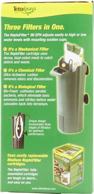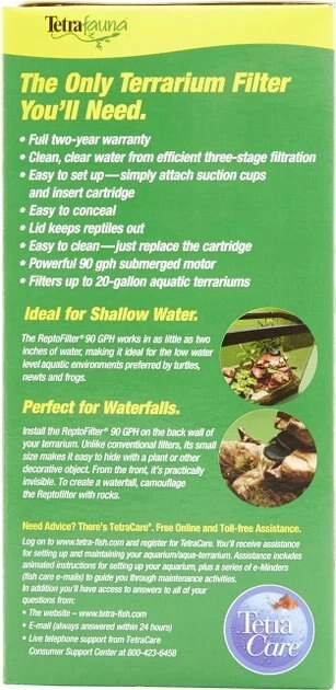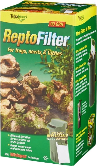 The Tetrafauna ReptoFilter for Frogs, Newts & Turtles provides crystal clear filtration for aquatic terrariums. It uses patented Whisper technology for silent operation as it moves the water through three stages of filtration. The removable filter cartridges catch organic debris and remove odors and discoloration from your tank. This filter works in as little as three inches of water, so it’s the ideal choice for the shallow pools found in turtle, newt and frog habitats. It’s also great for creating waterfalls. Simply attach the suction cups to a terrarium wall and cover the filter with decorative rocks or plants. The green color makes it easy to conceal, and the protective lid keeps reptiles out. The medium 90 GPH filter is effective in terrariums up to 20 gallons, and the large 125 GPH works for tanks up to 55 gallons.