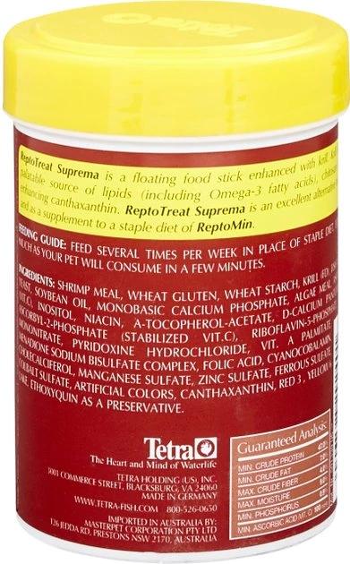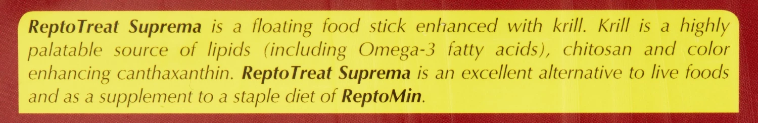 Give your turtle, newt or frog a boost of protein with Tetrafauna ReptoTreat Supreme Krill Enriched Sticks Turtle, Newt & Frog Treats. These pets love variety in their diet and they really love krill. Tetrafauna ReptoTreat Supreme Krill Enriched Sticks Turtle, Newt & Frog Treats is a protein-rich blend of shrimp meal, krill and fish meal and make a great addition to staple diets. A great alternative to live food, Tetrafauna ReptoTreat Supreme Krill Enriched Sticks Turtle, Newt & Frog Treats are a great way to entice your pet to the surface for a little interaction.