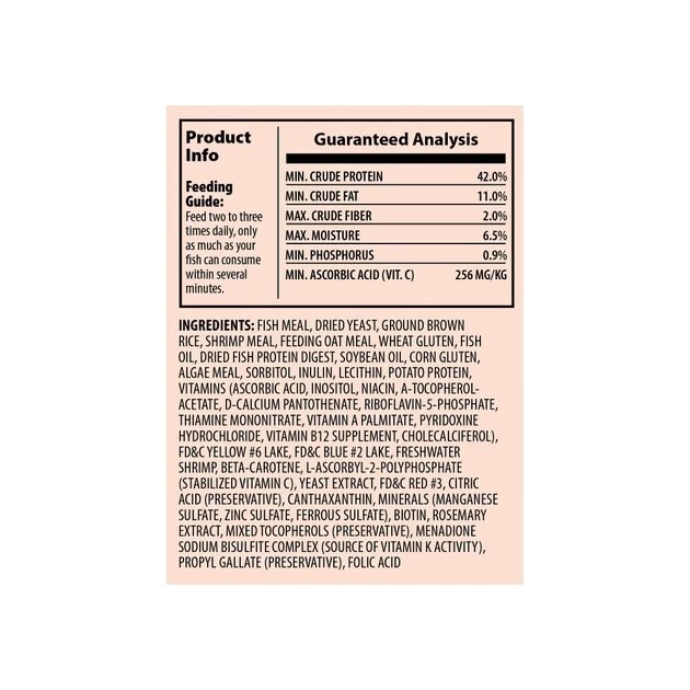 Fish Meal, Ground Brown Rice, Dried Yeast, Shrimp Meal,Feeding Oat Meal, Wheat Gluten, Fish Oil Soybean Oil, Corn Gluten, Algae Meal, Sorbitol, Lecithin, Potato Protein, Yeast Extract, Ascorbic Acid, Inositol, Niacin, L-Ascorbyl 2 Polyphosphate, A-Tocopherol Acetate, D-Calcium Pantothenate, Thiamine Mononitrate, Menadione Sodium Bisulfite Complex, Folic Acid, Pyridoxine Hydrochloride, Vitamin A Palmitate, Biotin, Vitamin B12 Supplement, Cholecalciferol, Manganese Sulfate Monohydrate, Zinc Sulfate Monhydrate, Ferrous Sulfate Monohydrate, Cobalt Nitrate Hexahydrate.