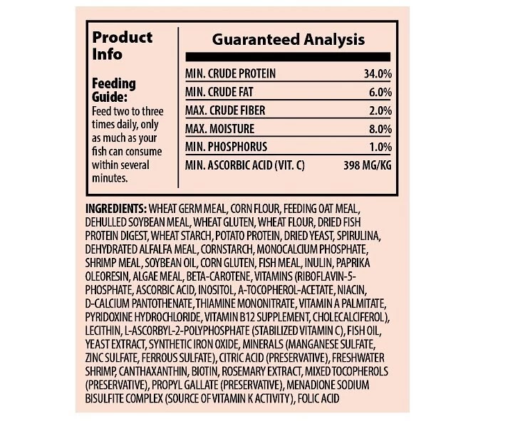 Wheat Germ Meal, Corn Flour, Feeding Oat Meal, Dehulled Soybean Meal, Wheat Gluten, Fish Meal, Wheat Flour, Wheat Starch, Dried Yeast, Potato Protein, Algae Meal, Dehydrated Alfalfa Meal, Corn Starch, Shrimp Meal, Monobasic Calcium Phosphate, Soybean Oil, Corn Gluten, Lecithin, Fish Oil, Yeast Extract, Ascorbic Acid, Inositol, L-Ascorbyl 2 Polyphosphate, Niacin, A-Tocopherol Acetate, Riboflavins 5 Phosphate, D-Calcium Pantothenate, Thiamine Mononitrate, Pyridoxine Hydrochloride, Vitamin A Palmitate, Menadione Sodium Bisulfite Complex, Biotin, Folci Acid, Cyanocobalamin, Cholecalciferol, Manganese Sulfate Monohydrate, Zinc Sulfate Monohydrate, Ferrous Sulfate Monohydrate, Cobalt Nitrate Hexahydrate.