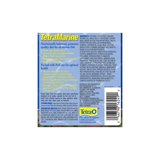 Take the challenge out of feeding your marine fish with Tetra TetraMarine Saltwater Flakes Marine Fish Food. Because marine fish come from the wild, it can be difficult to maintain their natural diet and keep them healthy. Tetra TetraMarine Saltwater Flakes Marine Fish Food is a proven, successful staple flake diet for small and growing marine fish. It is scientifically formulated with Omega-3 fatty acids and biotin supplement for energy and delivers concentrated nutrition for less waste.