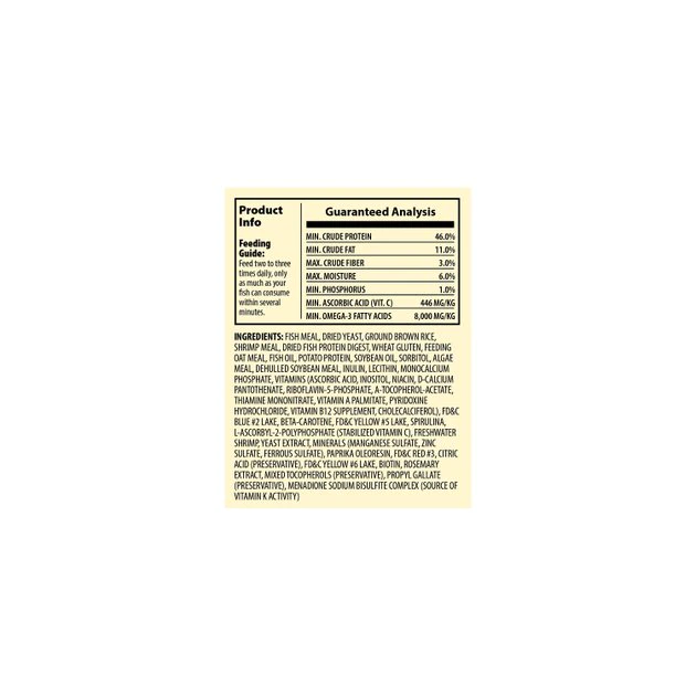 Fish Meal, Dried Yeast, Ground Brown Rice, Shrimp Meal, Wheat Gluten, Feeding Oat Meal,Fish Oil, Potato Protein, Dehulled Soybean Meal, Soybean Oil, Algae Meal, Sorbitol, Lecithin, Monobasic Calcium Phosphate, Ascorbic Acid, Yeast Extract, Inositol, Niacin, L-Ascorbyl 2 Polyphosphate, Riboflavin 5 Phosphate, A- Tocopherol Acetate, D-Calcium Pantothenate, Thiamine Mononitrate, Pyridoxine Hydrochloride, Vitamin A Palmitate, Menadione Sodium Bisulfite Complex, Biotin, Vitamin B12 Supplement, Cholecalciferol, Manganese Sulfate, Monohydrate, Zinc Sulfate Monohydrate, Ferrous Sulfate Monohydrate, Cobalt Acetate.